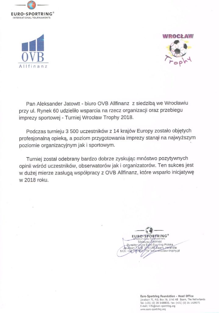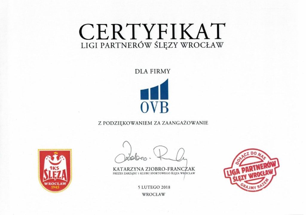 Współpracujemy z klubem sportowym 1 KS Ślęza Wrocław, który zrzesza ponad 1.000 dzieci uprawiających koszykówkę oraz piłkę nożną. Ubezpieczamy klub III ligi piłki nożnej oraz współpracujemy z ekstraklasowym zespołem koszykarek